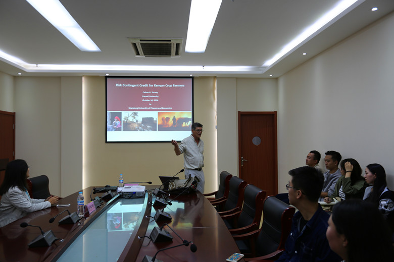 Calum教授从风险管理与保险角度,梳理了全球范围内特别是亚非拉国家的农村经济发展、农业融资困难及“贫困陷阱”等问题的诸种缘由,结合其在肯尼亚的调研项目介绍了现代农业发展面临的各种风险,探讨了农村信贷与保险模式的必要性,利用蒙特卡洛模型对该模式的可操作性进行了风险模拟演示,并详细讲解了相关的产品定价数理模型。最后,Calum教授还对农业保险的广阔前景进行了展望。讲座最后,大家就农业保险、农村信贷产品、中美保险市场差异等与Calum教授进行了充分的交流。这次讲座活动使得师生们了解到了此领域最新的前沿发展,并从理论和实践应用角度引发了诸多思考,受益匪浅。