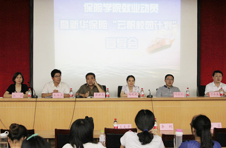 2010级学生就业动员暨新华保险“云帆暑期实习营”宣导会在舜耕校区举行。学校就业指导处处长苏洪志、学院院长闫庆悦、党总支书记朱传武、新华人寿保险山东分公司人力资源部总经理杨艳艳、副总经理刁永晨、学院就业办老师和全体2010级学生参加会议。会议由学院党总支副书记张娟主持。