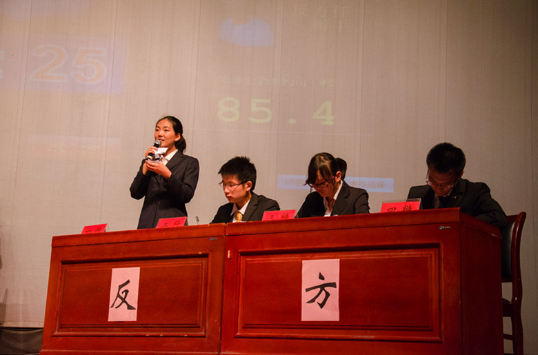 持反方观点,即“学术造假主要错在制度”。比赛开始之后,双方辩手你来我往,精彩发言不时赢得台下观众的阵阵掌声。在最为紧张激烈的自由辩论环节,双方唇枪舌剑,场面难分高下,此时反方抓住正方立论中将“主要作用”等同于“决定作用”的不当之处进行进攻,完成了关键的一击。在最后一个环节总结陈词中,四辩王琦声情并茂地对整场比赛进行了总结,锦上添花的表现深深打动了在场的每一位观众。