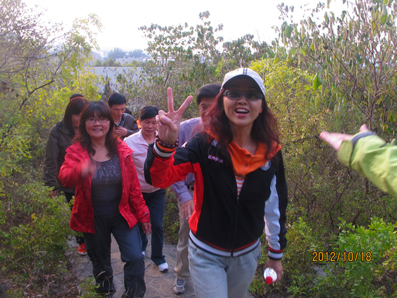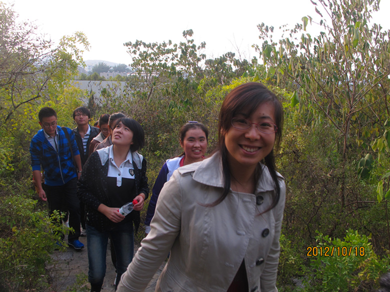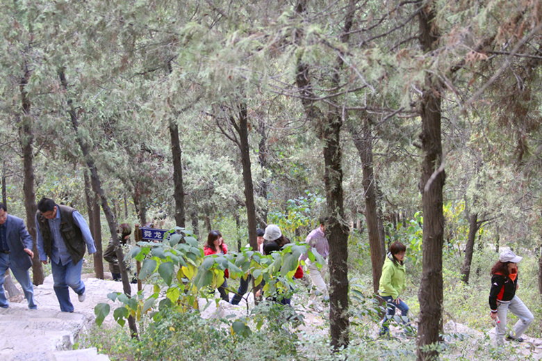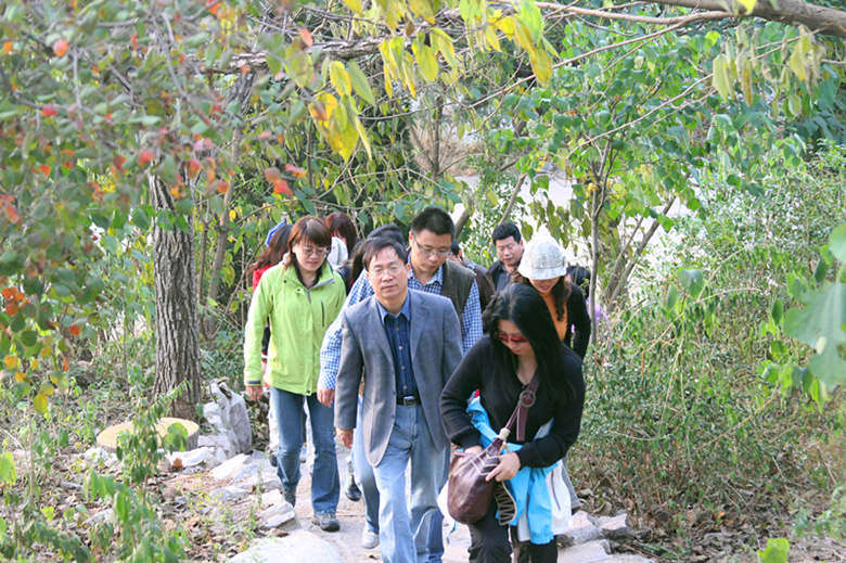 深秋季节的金鸡岭,山麓沟壑处红叶似火,景色迷人。山中曲径交错,草木层叠,碎石嶙嶙。一进景区,清新的空气便扑面而来,绿树、野花、点缀在枝头红色的山枣,山间还不时会传来几声鸟鸣,让每个人都感受到了大自然的魅力。登山途中,大家有说有笑,一边欣赏着大自然美景,一边谈天说地。有的老师疾步如飞,勇于争先;有的老师拾级而上,两两并肩,交谈而行,时而驻足欣赏热心山友雕刻的摩崖题刻;有的老师频频举起手中的相机,记录下沿途的美景,老师们的身影也成为了镜头中最靓丽的色彩。大家完全忘记了平日工作的辛苦和此时登山的疲劳,处处其乐融融,洋溢着欢声笑语。