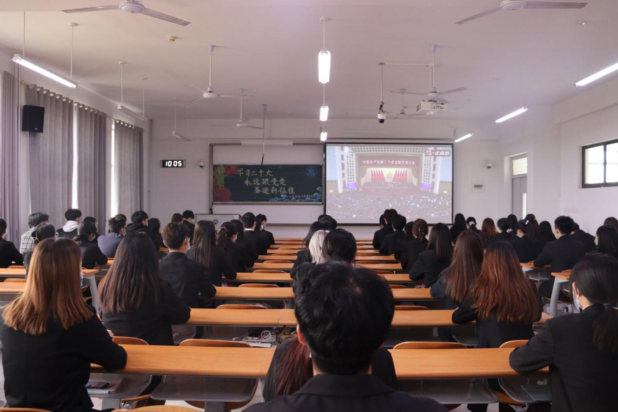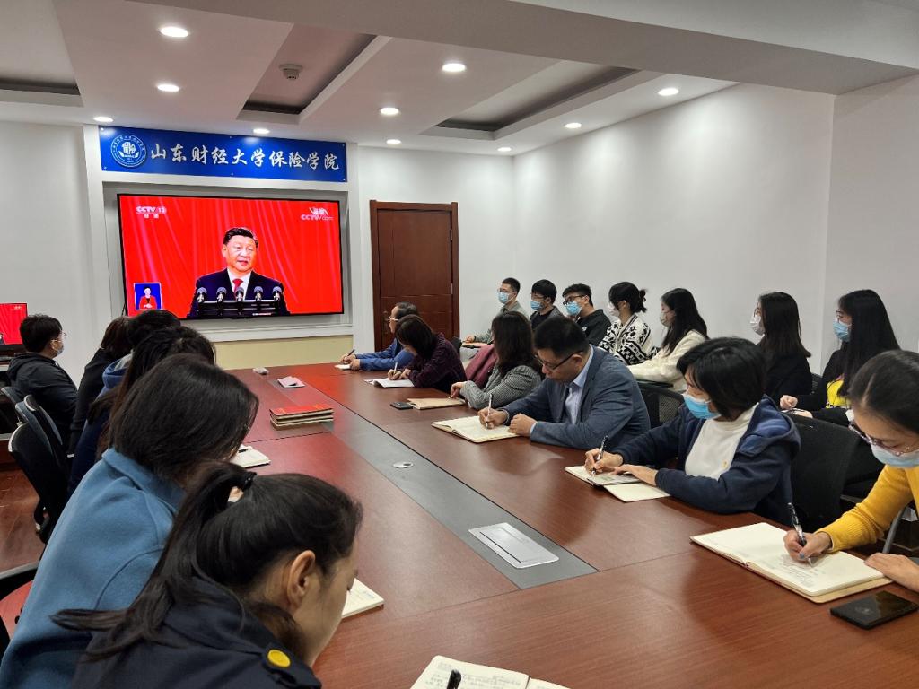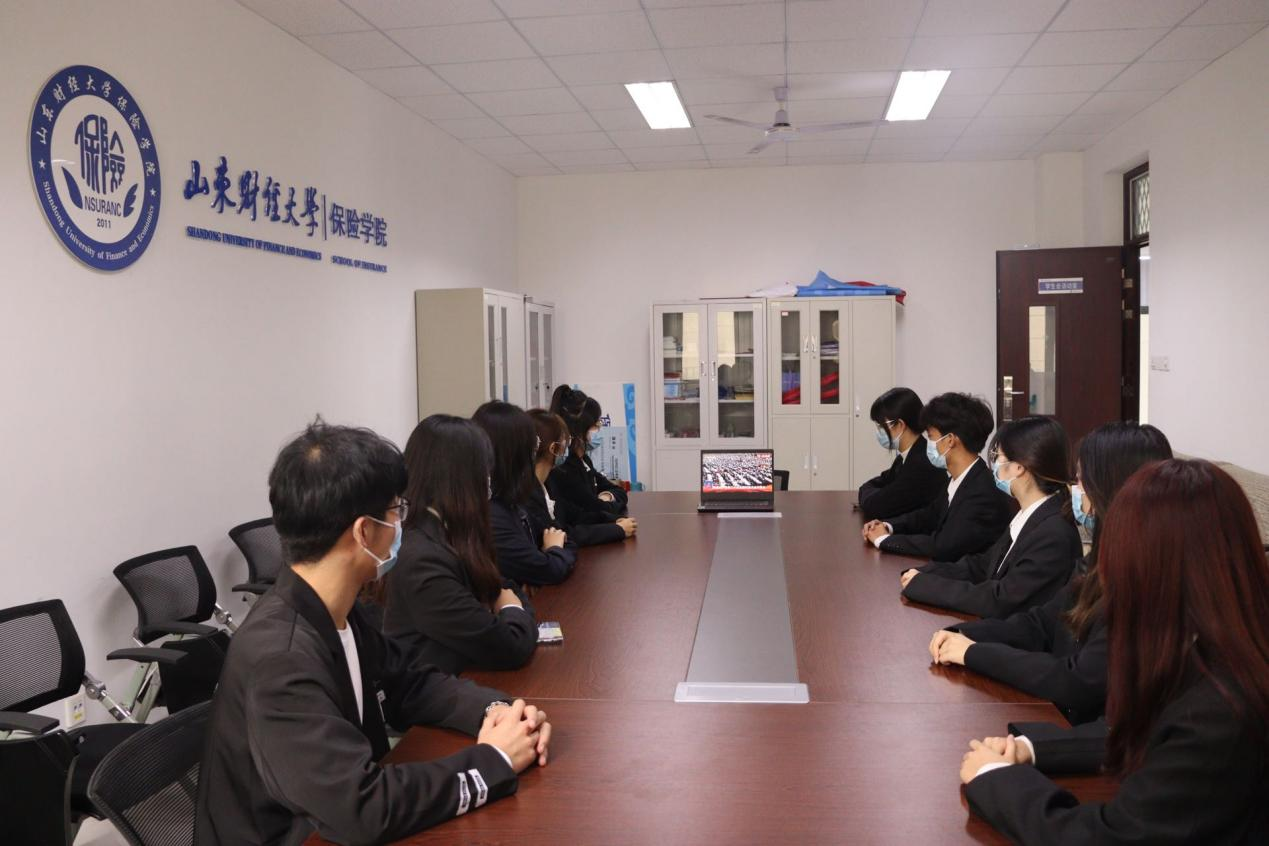 学院领导班子成员、部分教师、学生第一党支部党员于舜耕校区办公楼1108会议室集中收看,圣井校区学生干部、学生党员分别在圣井校区7号教学楼7214教室、7-201学院会议室集中收看。