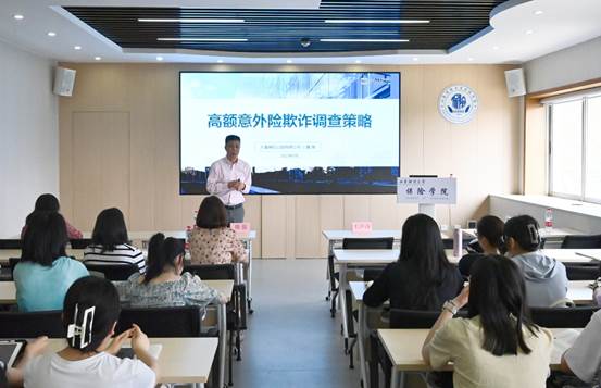 随后,魏强先生以“高额意外险欺诈案件调查策略”为题进行报告。报告首先分析意外险产品和市场变化趋势,概括高额意外险欺诈案件常见特征、常见风险点、常见事故类型,然后针对造作伤和交通事故两个高额意外险案件处理难点,应坚持实地调研,贯彻落实生活常识、经验法则八字方针,最后结合“颜某1880万骗保案”“郝某断指案”“交通溺亡案”等案例,详细介绍保险公估人员在寻找疑点和立案证据、查勘分析、成功结案等一系列破案流程。报告全程生动鲜活,细节丰富,充分调动了现场师生的兴趣点和积极性。