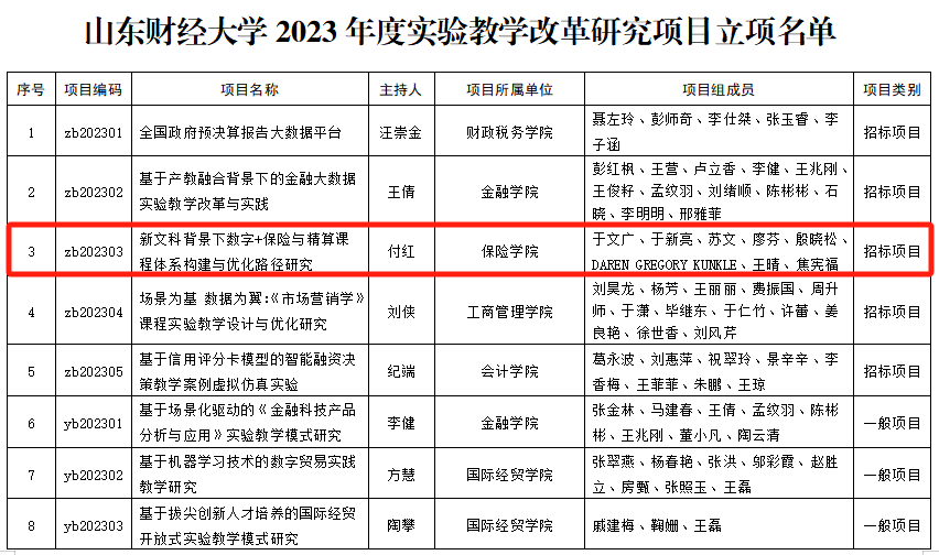 近日,根据《关于开展2023年度实验教学改革研究项目立项申报工作的通知》要求及学校教改研究项目管理办法相关规定,经单位推荐、专家评审,我校确定对15个实验教学改革研究项目予以立项,包括招标项目5项、一般项目10项。其中,由日本成人电影 付红副教授主持的实验教学改革研究项目《新文科背景下数字+保险与精算课程体系构建与优化路径研究》获批招标项目,按校级重点研究项目管理。
