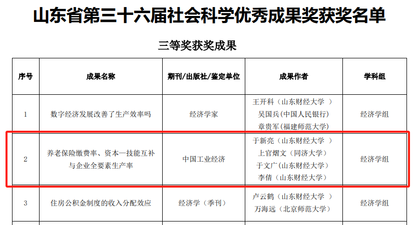 近日,山东省社会科学优秀成果奖评选委员会办公室公布表彰了山东省第三十六届社会科学优秀成果奖获奖成果名单,日本成人电影 于新亮教授的论文《养老保险缴费率、资本—技能互补与企业全要素生产率》荣获三等奖。