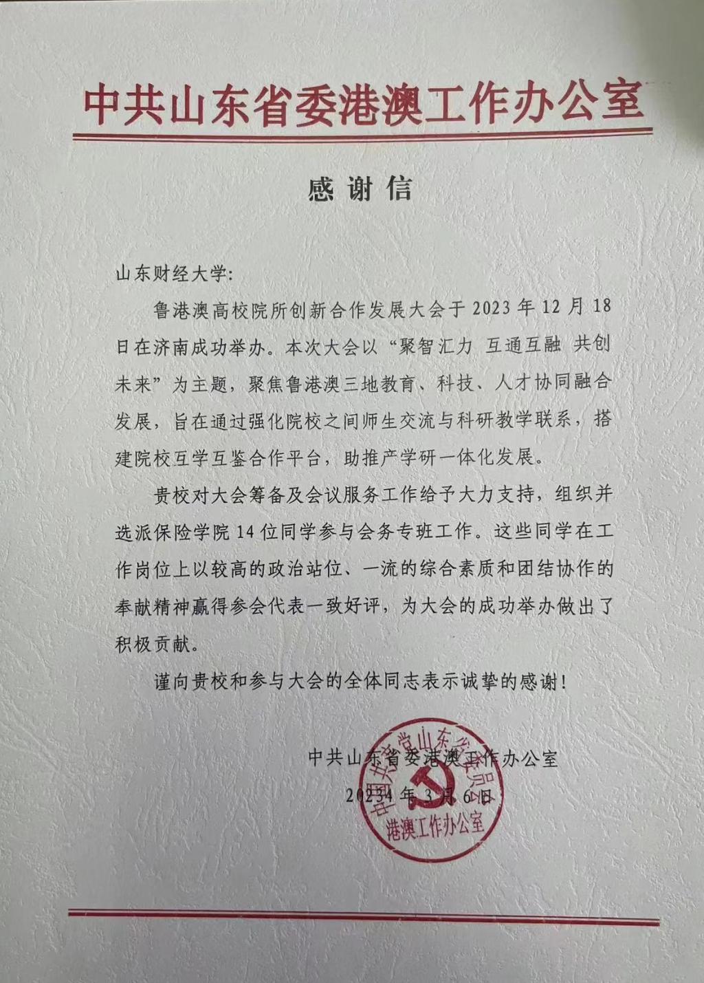 日前,我校收到了来自中共山东省委港澳工作办公室的感谢信,字里行间充满肯定,感谢我校为鲁港澳高校院所创新合作发展大会的筹备工作及会议服务工作给予的大力支持,对日本成人电影 选派的学生志愿者所表现出的综合素质、团结协作和奉献精神表示诚挚谢意。