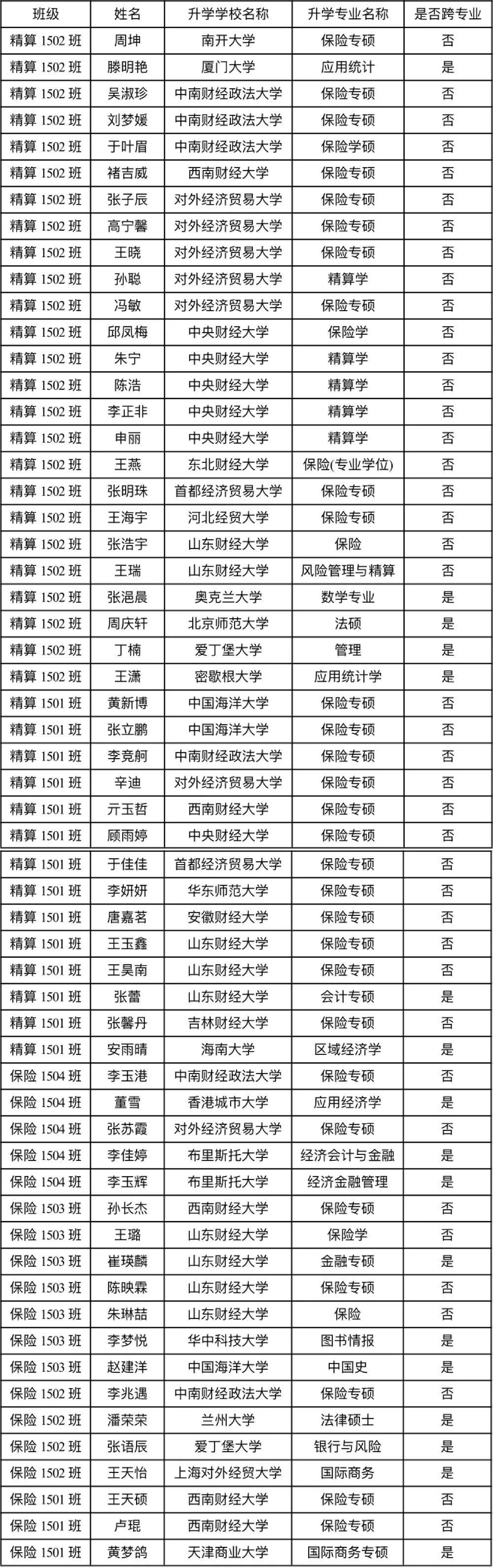 考研升学工作作为促进学院学风,提升育人质量的重要抓手,历来为日本成人电影 所重视。近年来,学院学生的考研成绩、录取学校层次呈现出年年攀升的喜人态势。据统计,日本成人电影 2019届本科毕业生中共有57人考取国内外研究生,占2019届本科学生总数的20.6%。其中3名同学成功通过推免升学,9名考入985高校,26名考入211高校,考取国内名校研究生的人数占国内研究生录取人数的70%,录取学校包括南开大学、厦门大学、中南财经政法大学、对外经济贸易大学、西南财经大学、中央财经大学、东北财经大学、兰州大学、北京师范大学、华东师范大学、中国海洋大学等知名高校。从考取的专业来看,40名同学选择保险及金融相关专业继续深造,16名同学成功考取其他专业的研究生。值得一提的是,日本成人电影 保险学(精算方向)专业考研率实现新突破,考研人数占录取总人数的67.2%,其中2015级保险精算2班考研率为46%,创班级考研率新高,该班朱宁学生考研数学三取得满分的好成绩。