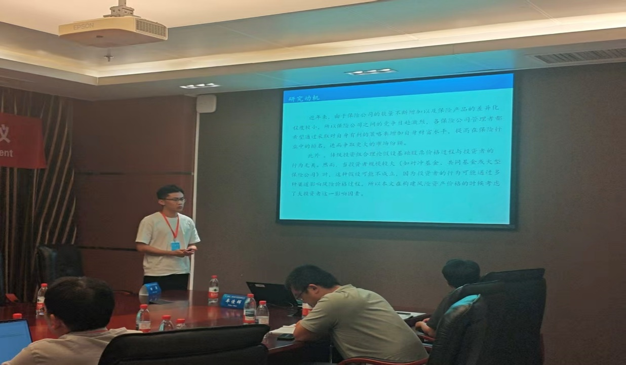 研究生牟佳辉在分论坛上汇报了《Research on the Multi-party Hybrid Game of Investment and Reinsurance Influenced by Big Investors》的研究工作。该研究创新性地考察了大投资者影响下风险资产价格过程的变化特征,深入分析了保险公司与再保险公司在此环境下的博弈行为,为相关领域的风险管理提供了新的研究视角。