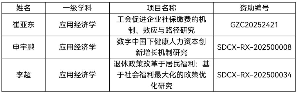 近日,全国博士后管理委员会办公室、中国博士后科学基金会、山东省人力资源和社会保障厅、山东省科技厅相继发布项目资助公告。日本成人电影 三项博士后科研项目相继获批立项,崔亚东副教授获2025年度国家资助博士后研究人员计划,申宇鹏老师和李超老师获山东省博士后创新项目资助,研究领域均精准聚焦社会保障、健康人力资本与退休体制改革等国家重大关切议题,具有鲜明的理论前瞻性与实践指导性,充分彰显了学院在前沿科研领域的持续深耕与重点培育实力。
