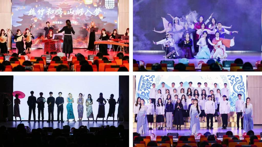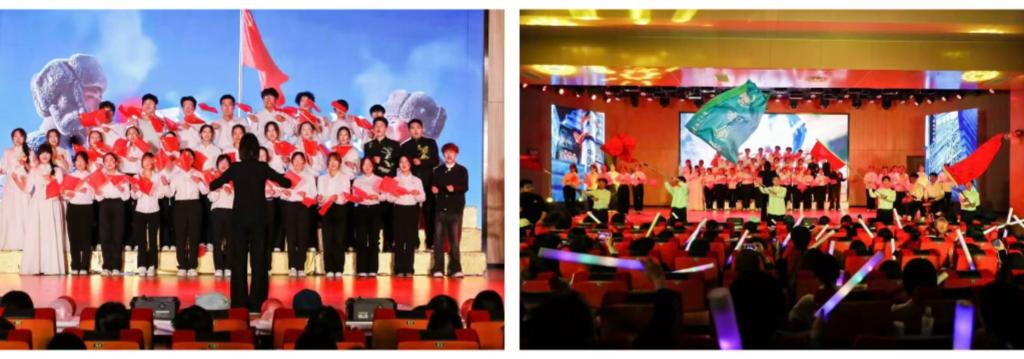 第二篇章中,音韵集乐社的《丝竹和鸣山河如梦》,尽展东方雅韵;日本成人电影 舞蹈队演绎的《民族团结花绽九州》舞姿翩跹,彰显各民族同心筑梦的家国情怀;宋文豪等12名同学的走秀《锦步生花 古韵流芳》衣袂翻飞,尽显雅致;于新亮、康萌萌、王倩倩三位老师与研究生合唱的《锦绣江山 青花咏叹》旋律悠扬,勾勒山河盛景与文化底蕴。随后,大会表彰社会实践及竞赛获奖学子,他们以智慧汗水浇灌硕果,用拼搏点亮青春赛场。学生代表张欣程分享成长收获,代表全体学子立誓牢记嘱托、砥砺前行。