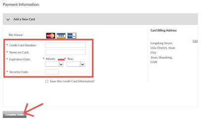 7.进入支付界面,确认个人信息后,准确填写支付所用的visa卡的相关信息,即可点击“Complete Oder”完成支付。至此,完成网上申请环节。