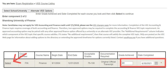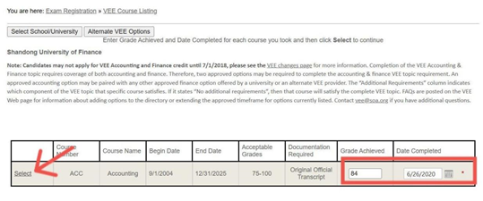 4.此时sdufer会看到课程选择对话框,根据前面的认证规则介绍,获得VEE Accounting and Finance资格需要达到《会计学》与《金融学》两门课程的成绩要求。首先填写弹出的《会计学》这门课程的信息,分数为教务系统上取得的分数,时间为期末考试出成绩的大概时间,不用特别准确。完成后点击“Select”。