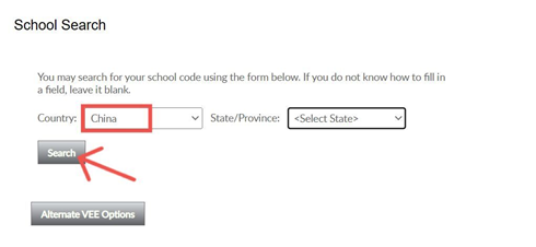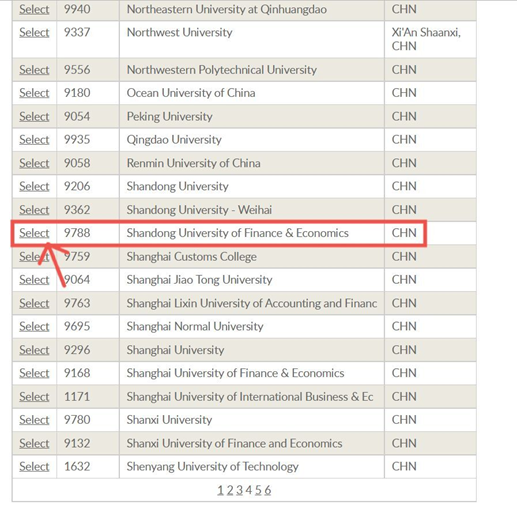 3.进入学校选择界面,国家选择“China”,点击“Search”。并继续点击“Select”选中“9788 Shandong University of Finance&Economics”。
