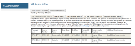 1.获得VEE Economics资格需要在学校完成《微观经济学》与《宏观经济学》两门课(或研究生《中级微观经济学》与《中级宏观经济学》 )的学习,并且期末成绩≥75分即可通过认证。